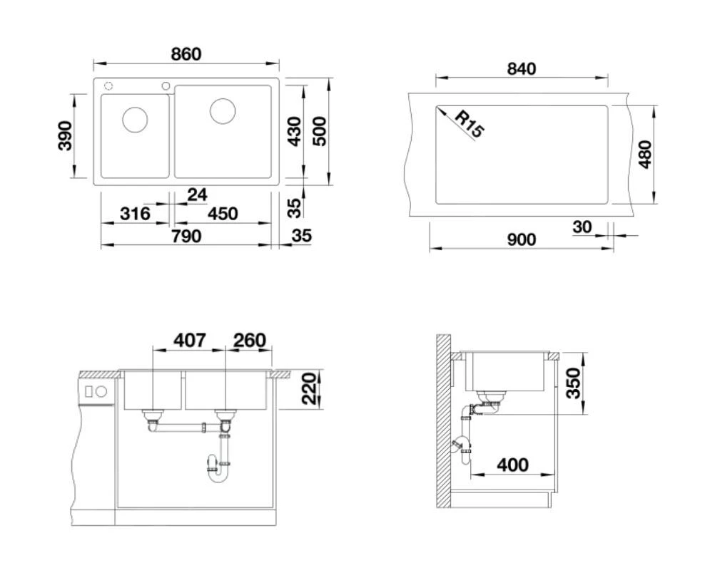 - dimensioni totali del lavello: 860 x 500 mm