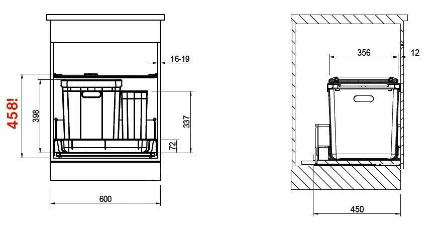 I cestini delle linee 350, Trolley Vario e Easysort sono collocati in un cassetto con estrazione completa dotato di un rivestimento longitudinale o di una parete laterale alta. Per questi cestini consigliamo le estrazioni complete delle aziende Blum, Grass e Hettich.