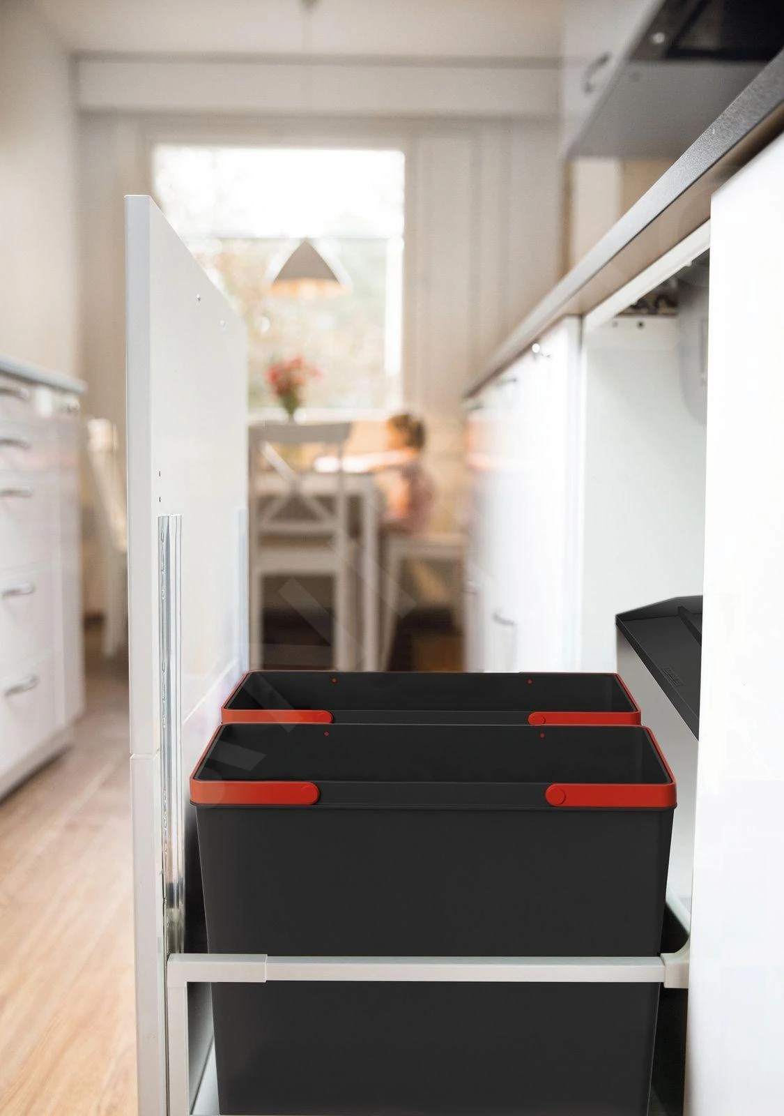 Consente una comoda differenziazione dei rifiuti. I cestini per la raccolta differenziata sono realizzati in materiale antisettico riciclato, che riduce l’incidenza di batteri fino al 99%. Il sistema è adattato agli armadietti larghi 45 e 60 cm dotati di cassetto. Il sistema EASYSORT offre una combinazione di 2 dimensioni di cestini e consente di differenziare fino a 4 tipi di rifiuti.